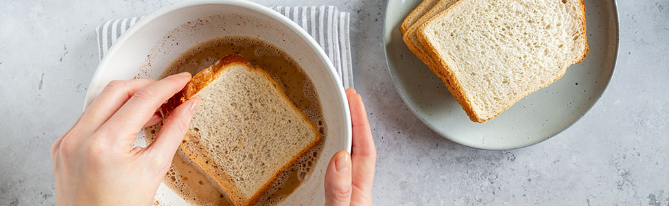 3. Bate las piezas de huevo con la leche y un chorrito de Vainilla Molina, y sumerge el pan relleno en la mezcla.