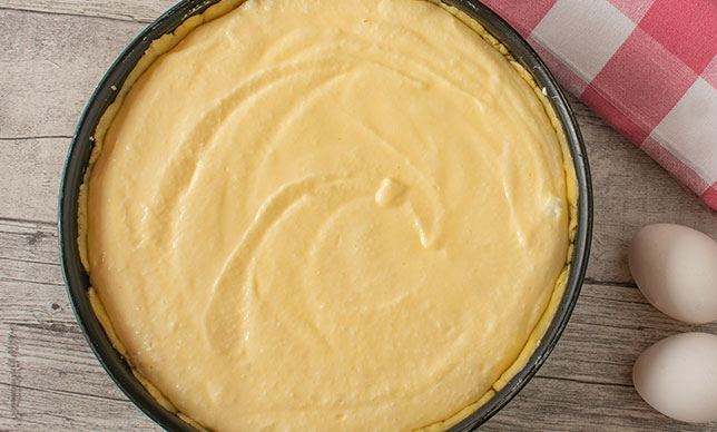 9. Coloca el molde dentro de una bandeja con agua caliente (baño María) para evitar que el cheesecake se agriete.