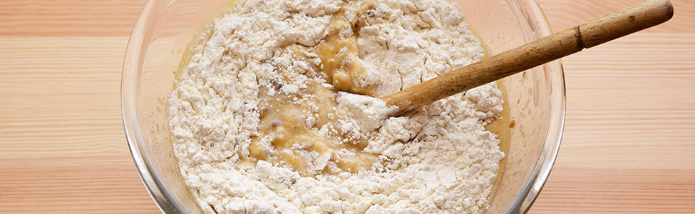 5. Añade los ingredientes secos a la mezcla de plátano en partes, mezclando hasta que esté todo integrado y, por último, agrega las nueces picadas.